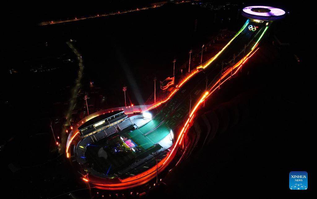 Aerial photo taken on Oct. 26, 2021 shows the National Ski Jumping Center during an event commemorating the countdown to Beijing 2022 with 100 days to go in Chongli district of Zhangjiakou City in north China's Hebei Province. With 100 days to go before the Beijing 2022 Winter Olympic Games, Chongli is ready to welcome the world. (Xinhua/Jin Haoyuan)