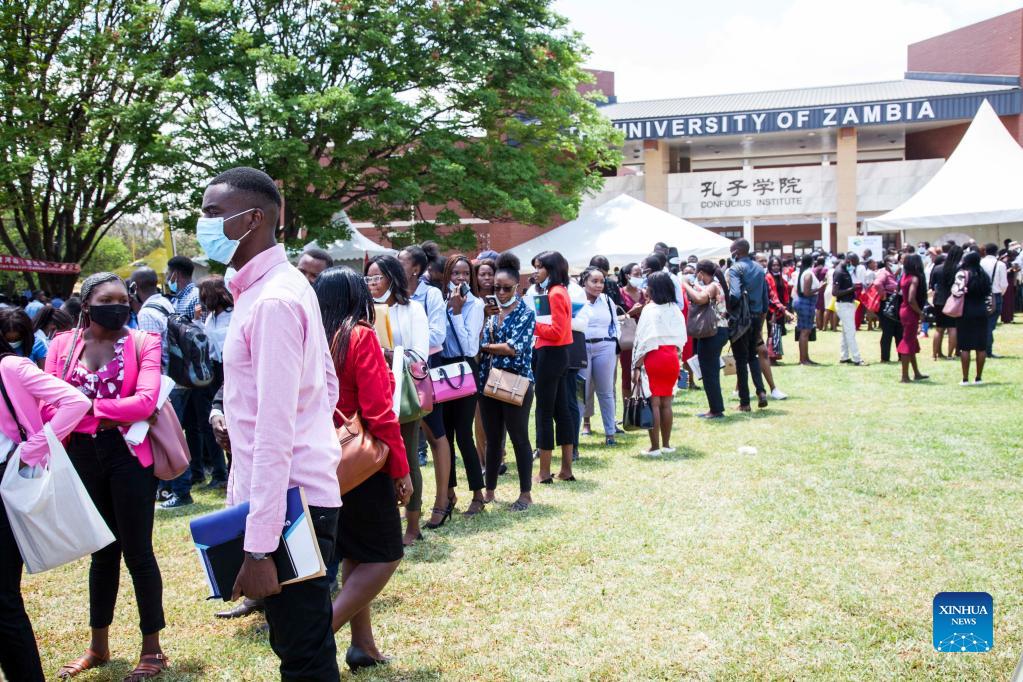 People attend a jobs and career expo at the University of Zambia in Lusaka, Zambia, on Oct. 27, 2021. The Confucius Institute at the University of Zambia (UNZA) on Wednesday held the fourth jobs and career expo where Chinese enterprises based in the southern African nation showcased themselves and tried to lure the local workforce, especially graduating students. (Photo by Martin Mbangweta/Xinhua)