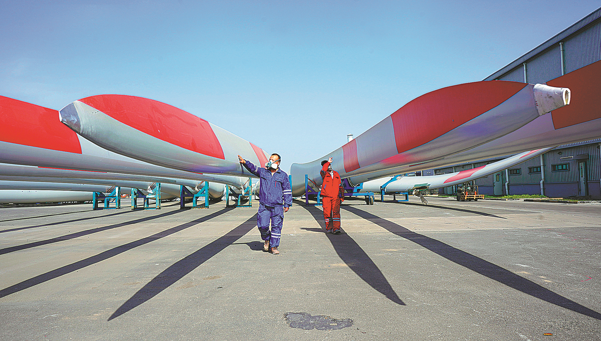 Technicians check wind power turbine blades at a new energy equipment manufacturer in Handan, Hebei province, in April. [Photo by Jin Haoyuan/Xinhua]
