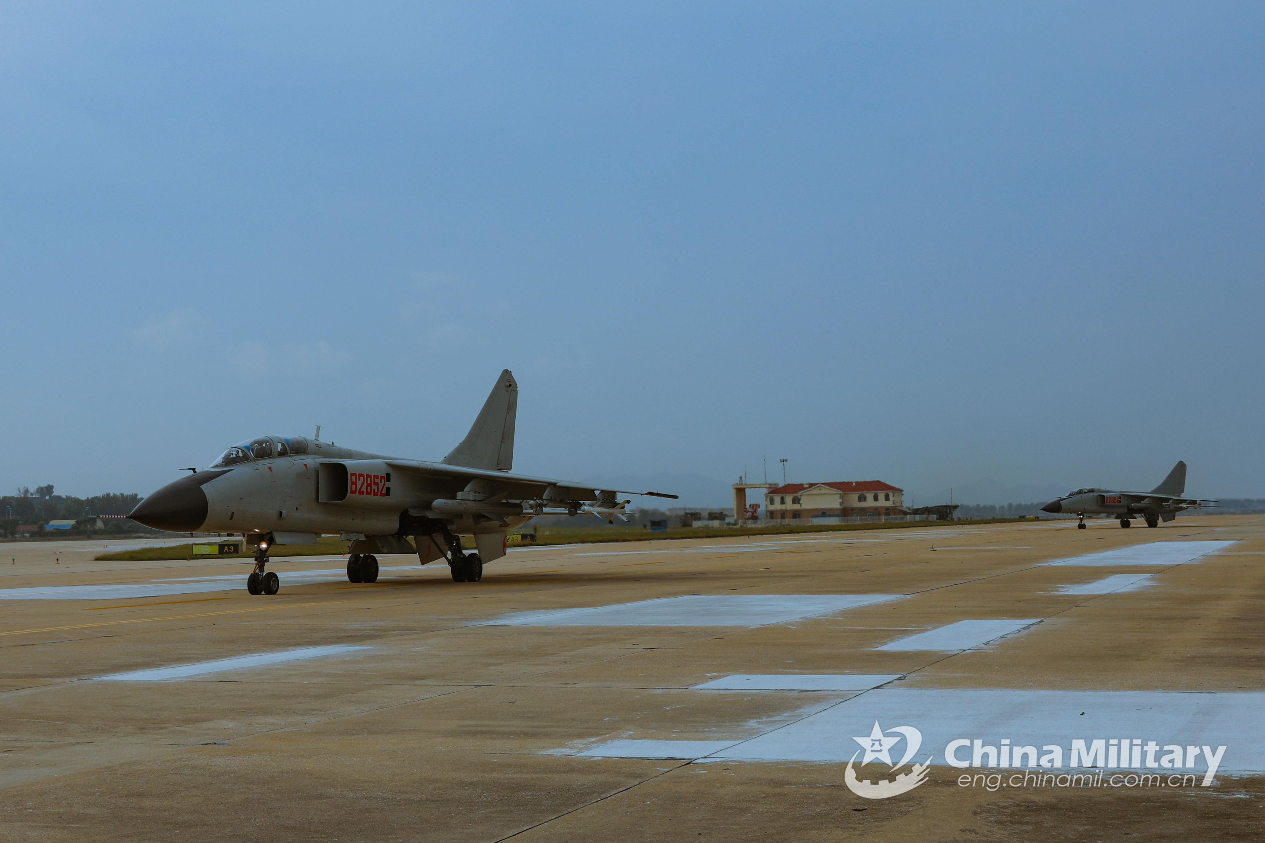 Fighter jets attached to a naval aviation brigade under the PLA Northern Theater Command taxi in formation before takeoff for an air-to-ground attack training exercise on September 7, 2021. (eng.chinamil.com.cn/Photo by Liu Xuhong)