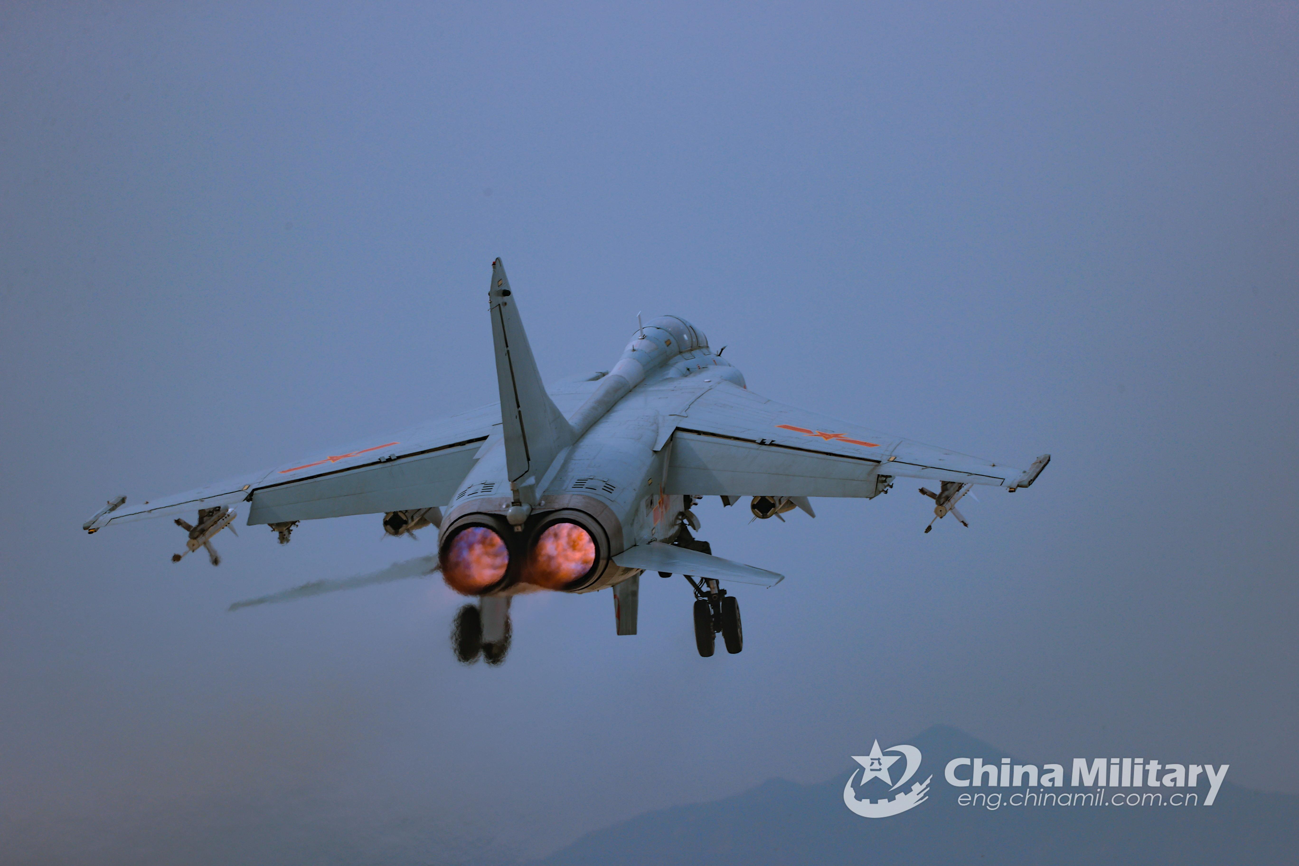 A fighter jet attached to a naval aviation brigade under the PLA Northern Theater Command roars into the sky during an air-to-ground attack training exercise on September 7, 2021. (eng.chinamil.com.cn/Photo by Liu Xuhong)