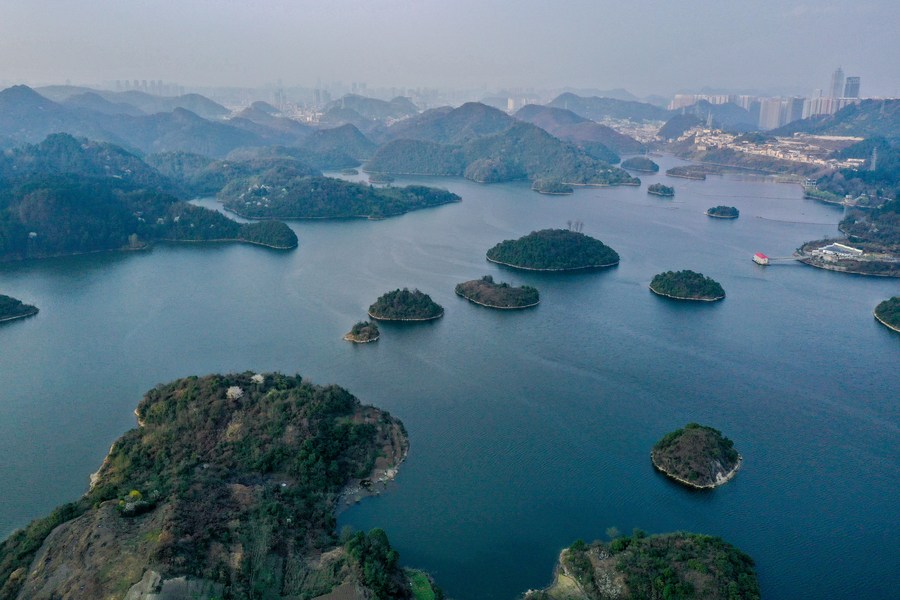 Aerial photo taken on Feb. 24, 2021 shows the scenery of Ahahu national wetland park in Guiyang City, southwest China's Guizhou Province. (Xinhua/Ou Dongqu)