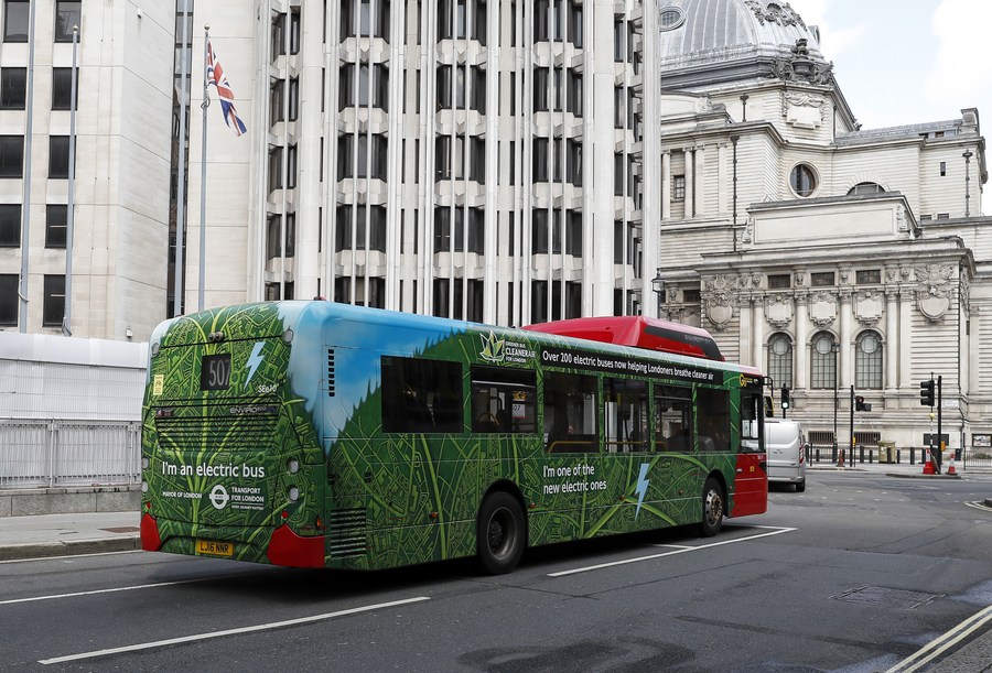 An electric bus runs on the street in London, Britain, Aug. 9, 2021.(Xinhua/Han Yan)
