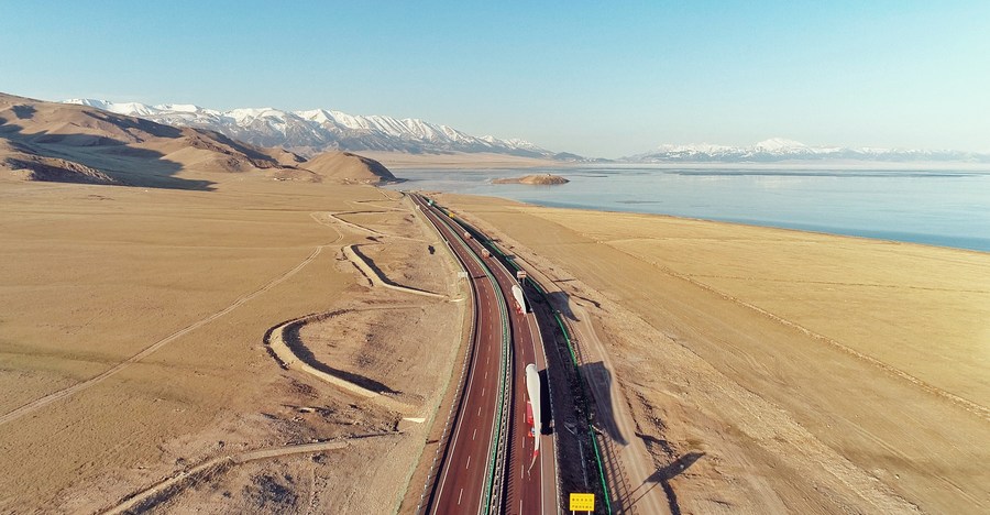Photo taken on April 24, 2020 shows trucks loaded with wind turbine blades running on a road along the Sayram Lake basin in northwest China's Xinjiang Uygur Autonomous Region. These wind turbine blades are used for a 50-megawatt wind farm in Kazakhstan's Kostanay Region. (Universal Energy/Handout via Xinhua)
