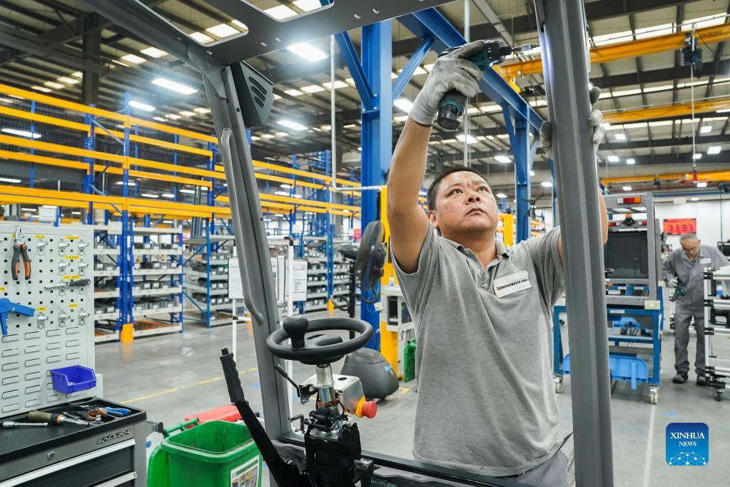 A worker works at a production line of Jungheinrich AG in Qingpu district of east China's Shanghai, Oct. 20, 2021. Jungheinrich AG, a leading intralogistics solutions provider based in Germany, would take part in the China International Import Expo (CIIE) for the fourth time this year. (Xinhua/Ding Ting)