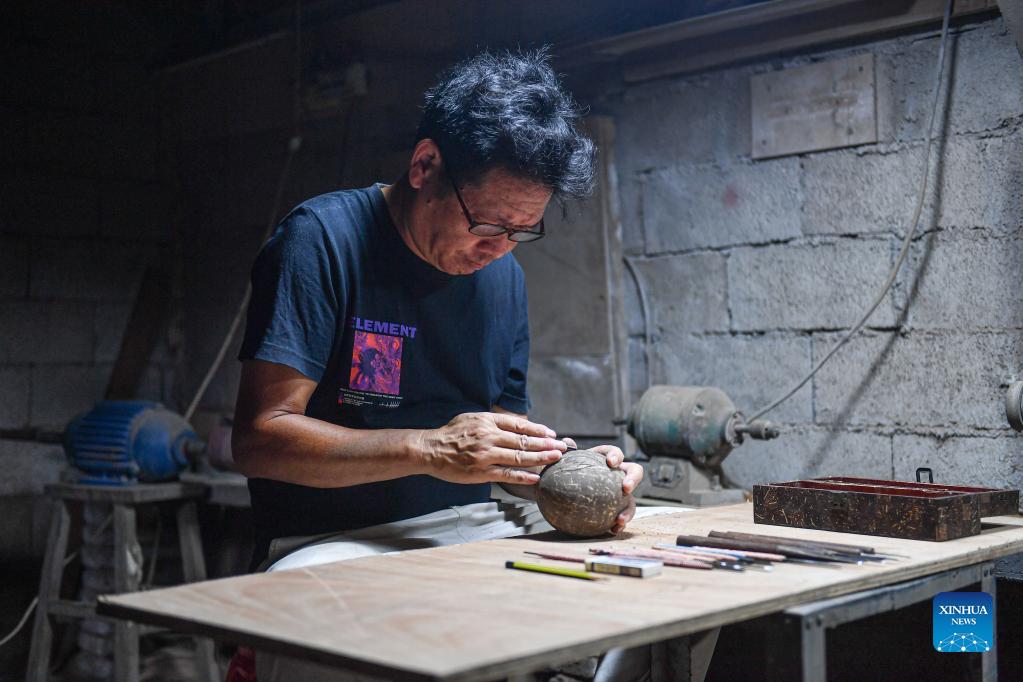 Ke Qiufeng carves on a coconut shell at his studio in Ruchuan Village of Haikou, south China's Hainan Province, Sept. 14, 2021. Coconut carving, one of China's national intangible Cultural Heritage, has a history of thousands of years in Hainan Province. Made of coconut shell, wood and palm as the material, a good coconut carving work needs to go through complicated procedures and requires refined skills and great patience of a craftsman. Ke Qiufeng, 51, has been engaging in coconut carving since 1994 when he began to learn the skill in a factory. "I just fell in love with it at the first sight," he said. In Ke's eyes, no matter he is making a decorative painting, a delicate vase or just a bowl people would use every day, it's a piece of art. "You must be extremely concentrated when you are carving, or you will get hurt by the knife," Ke said. After years of hard work, Ke has been selected as a representative inheritor of Hainan coconut carvings in the provincial level. In addition to making coconut carvings himself, Ke also gives lectures to students at Hainan Vocational and Technical College every week. Seeing fewer and fewer people would like to devote in this traditional skill, Ke Qiufeng is more worried than anyone. "The skill of coconut carving has been inherited for thousands of years. It would be a pity if it was lost in our generation. That's why I need to keep it alive," he said. (Xinhua/Pu Xiaoxu)