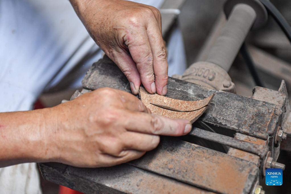 Ke Qiufeng cuts a coconut shell at his studio in Ruchuan Village of Haikou, south China's Hainan Province, Sept. 14, 2021. Coconut carving, one of China's national intangible Cultural Heritage, has a history of thousands of years in Hainan Province. Made of coconut shell, wood and palm as the material, a good coconut carving work needs to go through complicated procedures and requires refined skills and great patience of a craftsman. Ke Qiufeng, 51, has been engaging in coconut carving since 1994 when he began to learn the skill in a factory. "I just fell in love with it at the first sight," he said. In Ke's eyes, no matter he is making a decorative painting, a delicate vase or just a bowl people would use every day, it's a piece of art. "You must be extremely concentrated when you are carving, or you will get hurt by the knife," Ke said. After years of hard work, Ke has been selected as a representative inheritor of Hainan coconut carvings in the provincial level. In addition to making coconut carvings himself, Ke also gives lectures to students at Hainan Vocational and Technical College every week. Seeing fewer and fewer people would like to devote in this traditional skill, Ke Qiufeng is more worried than anyone. "The skill of coconut carving has been inherited for thousands of years. It would be a pity if it was lost in our generation. That's why I need to keep it alive," he said. (Xinhua/Pu Xiaoxu)