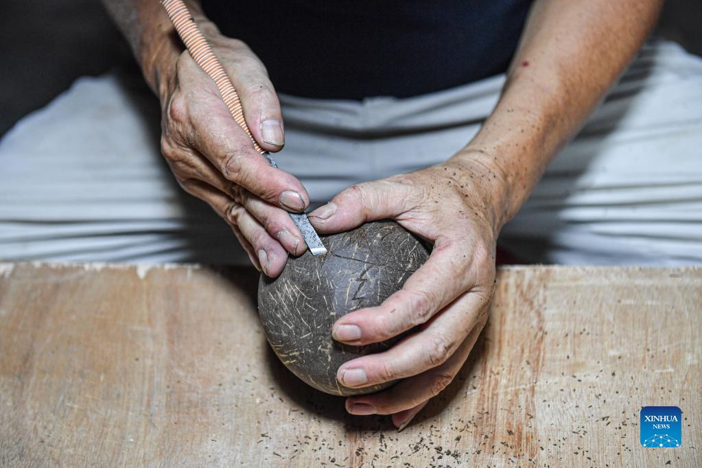 Ke Qiufeng carves on a coconut shell at his studio in Ruchuan Village of Haikou, south China's Hainan Province, Sept. 14, 2021. Coconut carving, one of China's national intangible Cultural Heritage, has a history of thousands of years in Hainan Province. Made of coconut shell, wood and palm as the material, a good coconut carving work needs to go through complicated procedures and requires refined skills and great patience of a craftsman. Ke Qiufeng, 51, has been engaging in coconut carving since 1994 when he began to learn the skill in a factory. "I just fell in love with it at the first sight," he said. In Ke's eyes, no matter he is making a decorative painting, a delicate vase or just a bowl people would use every day, it's a piece of art. "You must be extremely concentrated when you are carving, or you will get hurt by the knife," Ke said. After years of hard work, Ke has been selected as a representative inheritor of Hainan coconut carvings in the provincial level. In addition to making coconut carvings himself, Ke also gives lectures to students at Hainan Vocational and Technical College every week. Seeing fewer and fewer people would like to devote in this traditional skill, Ke Qiufeng is more worried than anyone. "The skill of coconut carving has been inherited for thousands of years. It would be a pity if it was lost in our generation. That's why I need to keep it alive," he said. (Xinhua/Pu Xiaoxu)