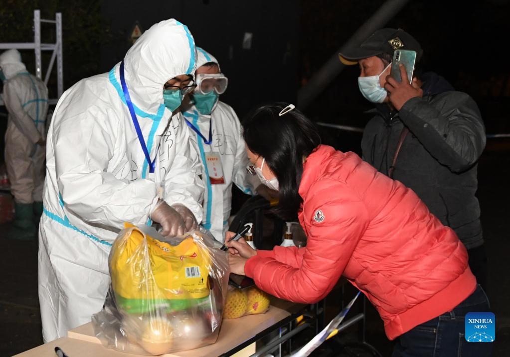 Staff members receive supplies at Furongli residential community in Haidian District in Beijing, capital of China, Oct. 26, 2021. Furongli has been put under closed-off management after one confirmed case of COVID-19 in the community on Oct. 24. Community workers and volunteers worked together to deliver daily necessities for residents during closed-off management. (Xinhua/Ren Chao)