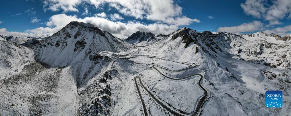 Aerial panoramic photo taken on Oct. 23, 2021 shows the winding road in Batang County, Tibetan Autonomous Prefecture of Garze, southwest China's Sichuan Province. (Xinhua/Xu Bingjie)