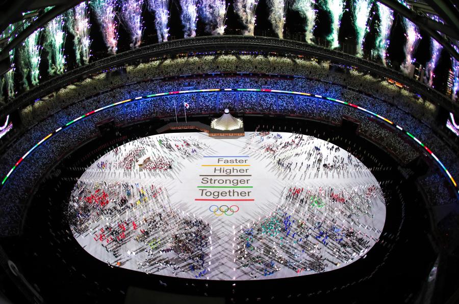 Photo taken on July 23, 2021 shows the Olympic Motto at the opening ceremony of Tokyo 2020 Olympic Games in Tokyo, Japan. (Xinhua/Xu Zijian, Chen Yichen, Wang Jingqiang)