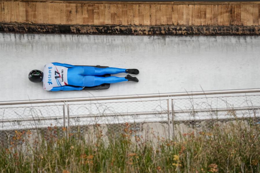 Amedeo Bagnis of Italy competes during a men's skeleton test event for the Beijing 2022 Olympic Winter Games at the National Sliding Center in Yanqing Zone, Beijing, capital of China, Oct. 25, 2021. (Xinhua/Peng Ziyang)