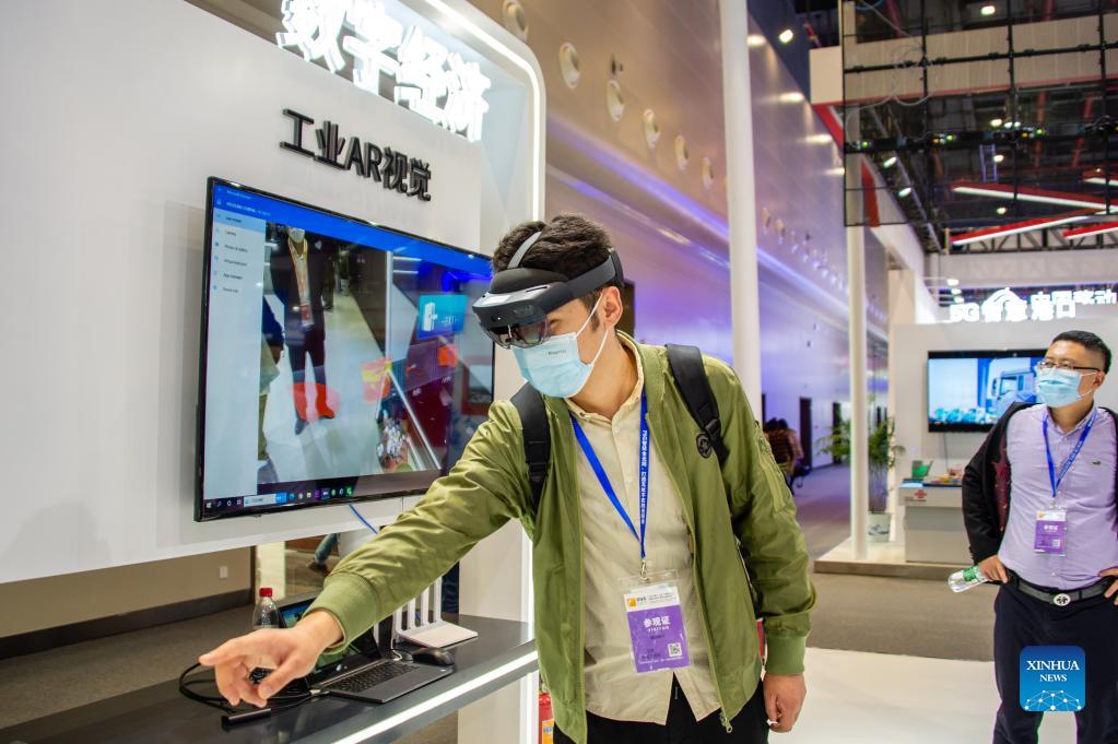A visitor tries an AR device during the 18th Optics Valley of China International Optoelectronic Exposition and Forum in Wuhan, central China's Hubei Province, Oct. 27, 2021. The expo and forum opened here on Wednesday. (Photo by Wu Zhizun/Xinhua)