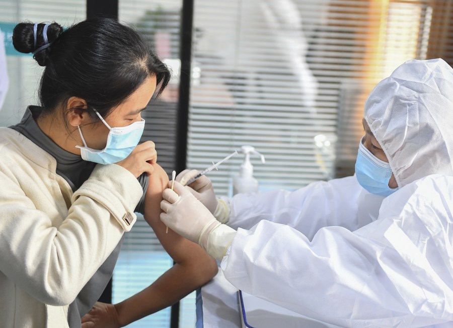 A resident gets a booster shot of the COVID-19 vaccine at a community service center in Tianxin District of Changsha, central China's Hunan Province, Oct. 26, 2021. (Xinhua/Chen Zeguo)