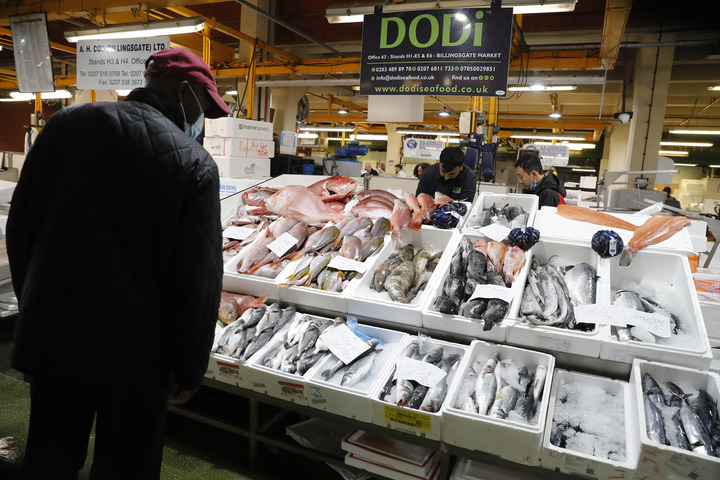 Photo taken on Oct. 15, 2021 shows customers shopping at Billingsgate Market in London, Britain. (Xinhua/Han Yan)