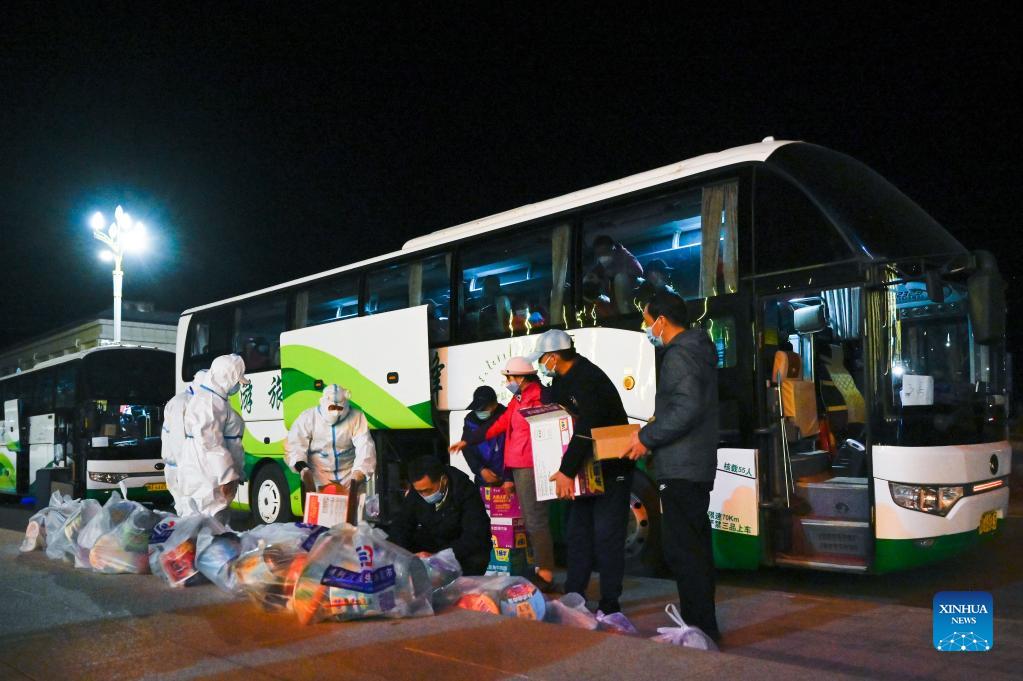 Food is distributed for the stranded tourists outside the Ejina Railway Station in Ejina Banner of Alxa League, north China's Inner Mongolia Autonomous Region, Oct. 27, 2021. The 586 stranded tourists leave Ejina Banner in the first batch by a chartered train at 21:52 Wednesday and is expected to arrive in Zhengzhou on Friday. (Xinhua/He Shuchen)