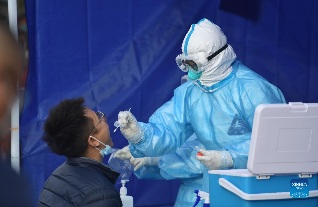 A medical worker takes a a swab sample from a citizen for nucleic acid testing in Xining, northwest China's Qinghai Province, Oct. 28, 2021. After Xining reported 3 new COVID-19 cases, local control of epidemic prevention has been strengthened. (Xinhua/Zhang Hongxiang)