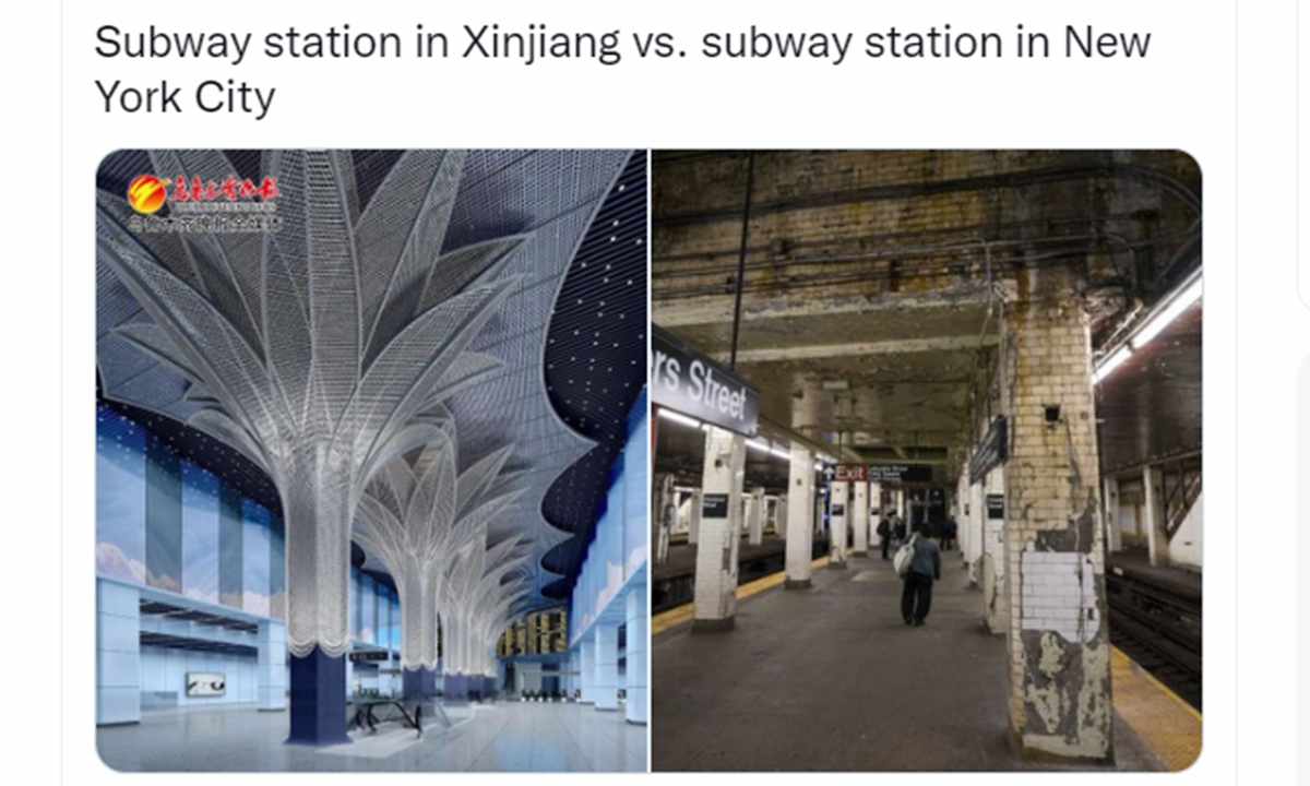 Pictures comparing a clean, bright and modern subway station in Urumqi, capital city of Northwest China's Xinjiang Uygur Autonomous Region, and an old, shabby one in New York City in the US have gone viral, adding proof of how lives in the remote region in China have improved after effective measures against terrorism and extremism since 2016 have restored stability.