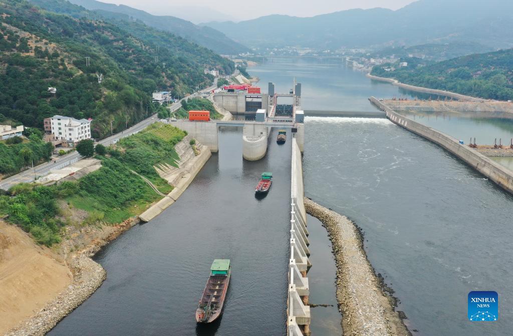 Aerial photo taken on Oct. 28, 2021 shows boats passing through a water gate on Minjiang River in southeast China's Fujian Province. (Xinhua/Lin Shanchuan)