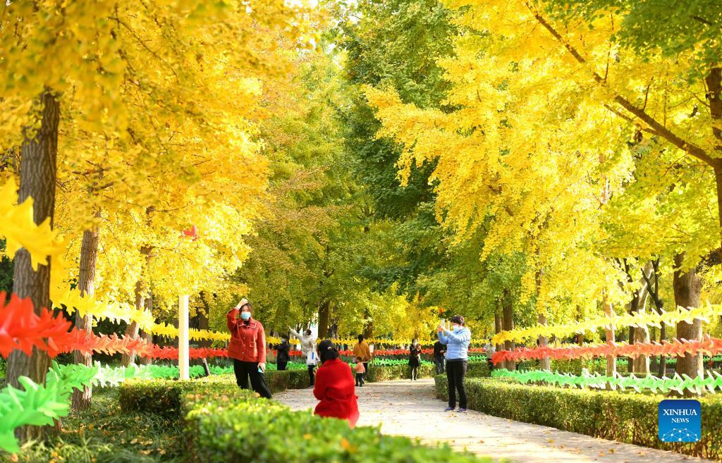 Aerial photo taken on Oct. 27, 2021 shows the autumn scenery in Haishan Park in Luquan District of Shijiazhuang, north China's Hebei Province. (Photo by Xu Jianyuan/Xinhua)