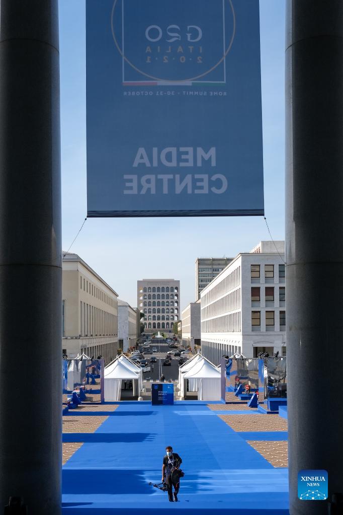 A cameraman is seen at the media center of the G20 Heads of State and Government Summit in Rome, Italy, on Oct. 28, 2021. The summit of the Group of 20 (G20) leading economies is about to kick off in Italy's capital amid tight security measures and with a packed agenda. (Xinhua/Zhang Cheng)