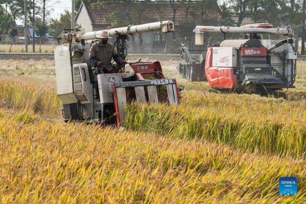 Photo taken on Oct. 28, 2021 shows reapers working in a field in Yujiaba Village of Shizong Township in Tongzhou District, Nantong City of east China's Jiangsu Province. (Xinhua/Li Bo)