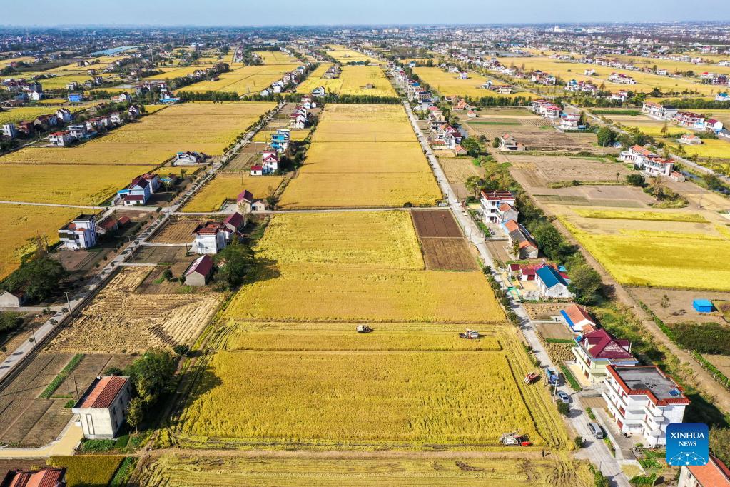 Aerial photo taken on Oct. 28, 2021 shows reapers working in a field in Yujiaba Village of Shizong Township in Tongzhou District, Nantong City of east China's Jiangsu Province. (Xinhua/Li Bo)