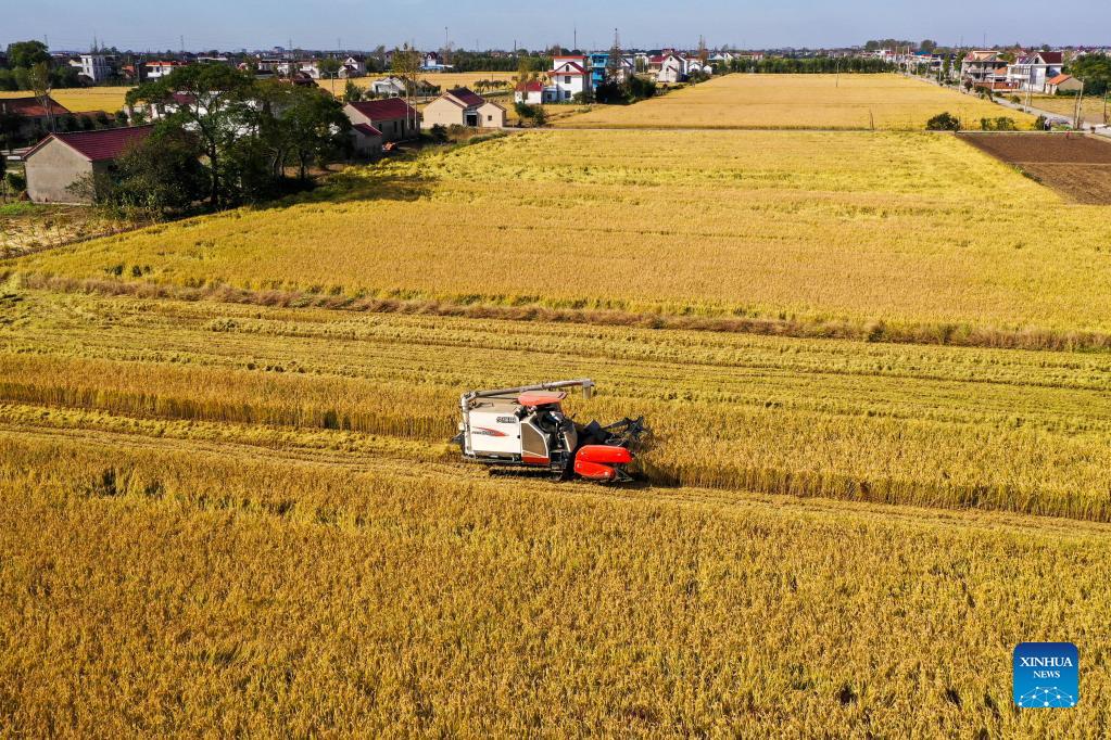 Aerial photo taken on Oct. 28, 2021 shows a reaper working in a field in Yujiaba Village of Shizong Township in Tongzhou District, Nantong City of east China's Jiangsu Province. (Xinhua/Li Bo)
