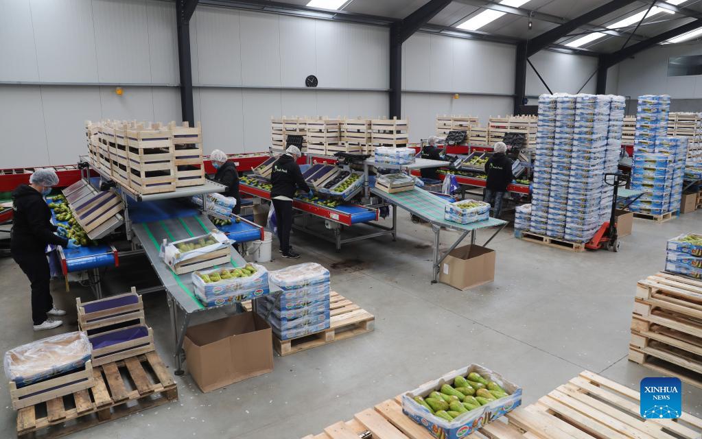 Staff members work at a packing station for Belaian conference pears in Sint-Gillis-Waas, Belgium, Oct. 22, 2021. At the upcoming 4th China International Import Expo (CIIE) to be held this November in Shanghai, Dole and BFV (Belgian Fruit Valley) will introduce a Belgian red conference pear to the Chinese and Asian market for the first time. This conference pear with dark red skin is a variety of the green conference pear which had sold well on the Chinese market for the past decade. (Xinhua/Zheng Huansong)