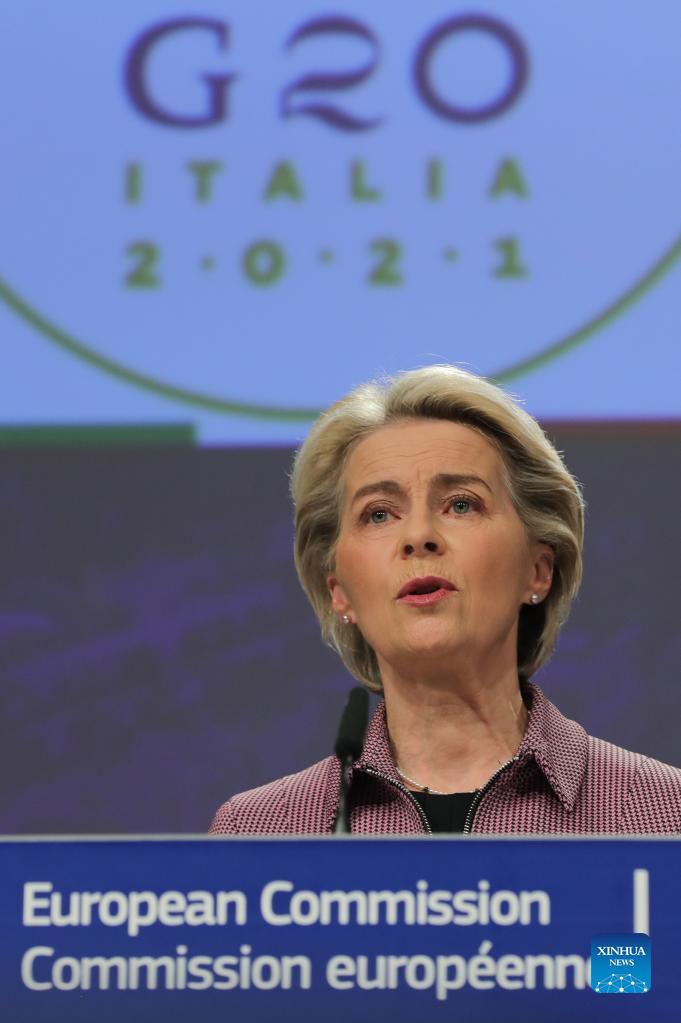 European Commission President Ursula von der Leyen speaks during a press conference ahead of the G20 Summit and the UN Climate Change Conference (COP26) in Brussels, Belgium, Oct. 28, 2021. (Xinhua/Zheng Huansong)