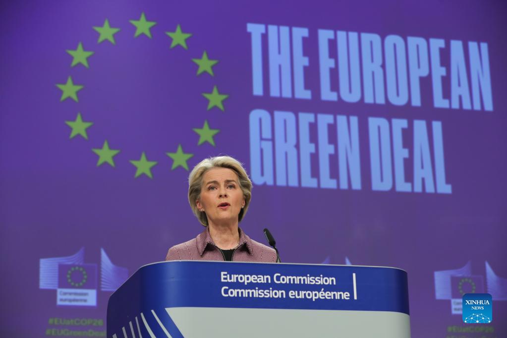 European Commission President Ursula von der Leyen speaks during a press conference ahead of the G20 Summit and the UN Climate Change Conference (COP26) in Brussels, Belgium, Oct. 28, 2021. (Xinhua/Zheng Huansong)