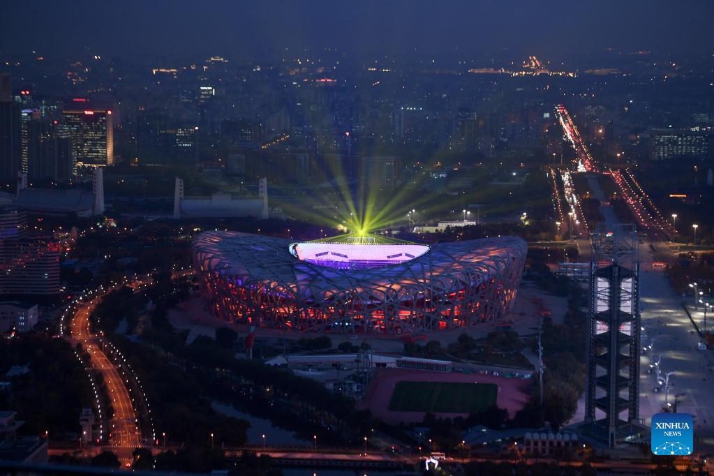 Picture taken with drone on Oct. 28, 2021 shows an aerial view of China's National Stadium. With the renovation of China's National Stadium completed on Oct. 28, 2021, all construction and renovation work of competition venues in Beijing are completed, including infrastructure and supporting facilities. (Xinhua/Zhang Chenlin)