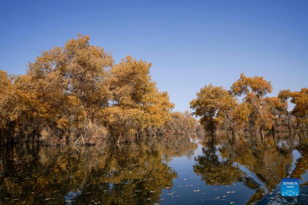 Photo taken on Oct. 27, 2021 shows poplar trees at Lop Nur National Wetland Park in Yuli County, Bayingolin Mongolian Autonomous Prefecture, northwest China's Xinjiang Uygur Autonomous Region. (Xinhua/Zhao Ge)
