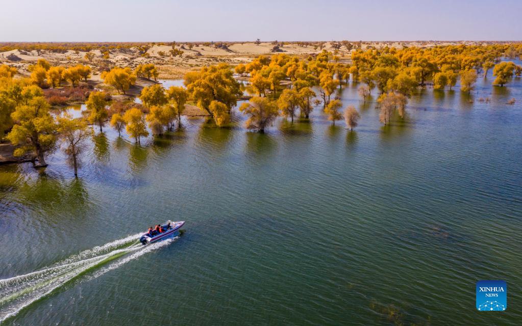 Aerial photo taken on Oct. 27, 2021 shows a view of Lop Nur National Wetland Park in Yuli County, Bayingolin Mongolian Autonomous Prefecture, northwest China's Xinjiang Uygur Autonomous Region. (Xinhua/Zhao Ge)