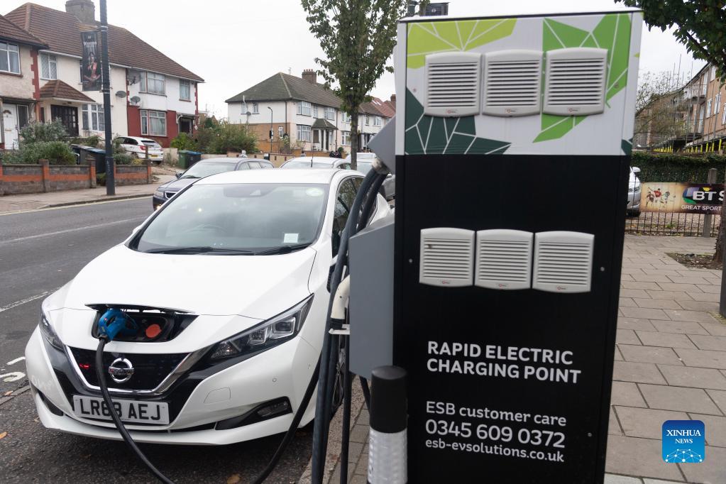 An electric car is seen at a charging point in London, Britain, Oct. 26, 2021. The 26th United Nations Climate Change Conference of the Parties (COP26) will be held from Oct. 31 to Nov. 12 in Glasgow. (Photo by Ray Tang/Xinhua)
