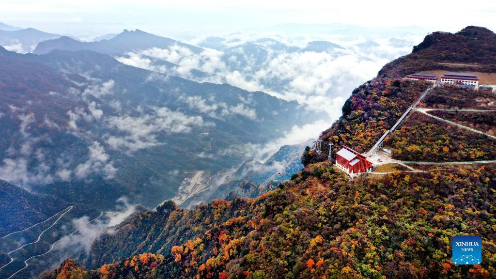 Aerial photo taken on Oct. 28, 2021 shows a view of Longtoushan scenic area in Hanzhong, northwest China's Shaanxi Province. (Xinhua/Tao Ming)
