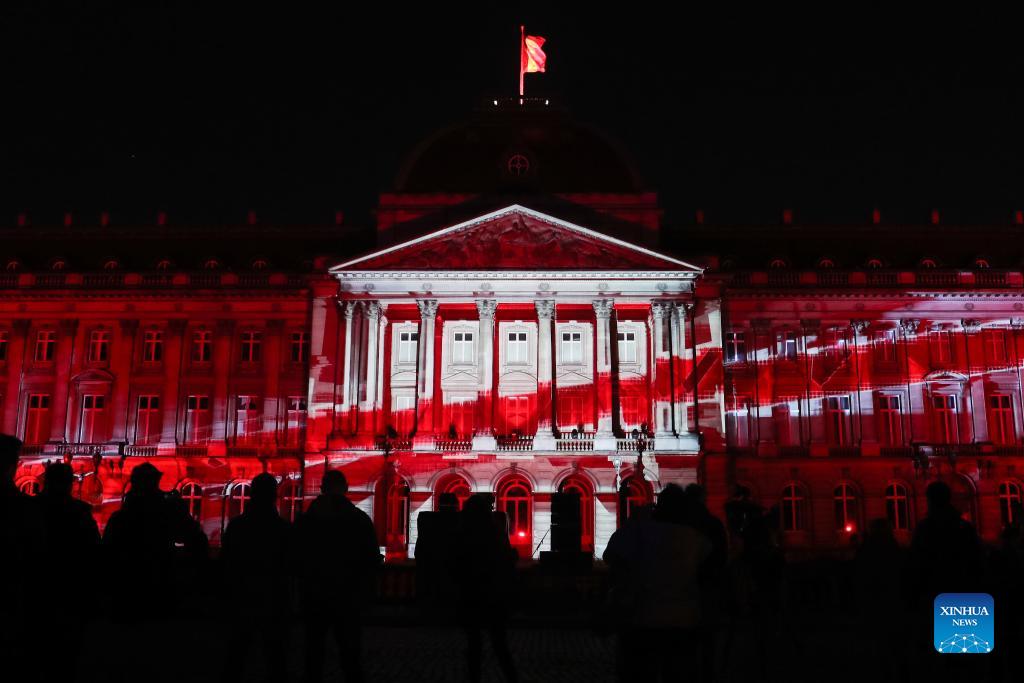 People watch a sound and light show at the Royal Palace in Brussels, Belgium, on Oct. 28, 2021. The ten-day event Bright Brussels, the festival of lights in Brussels, started on Thursday. (Xinhua/Zheng Huansong)