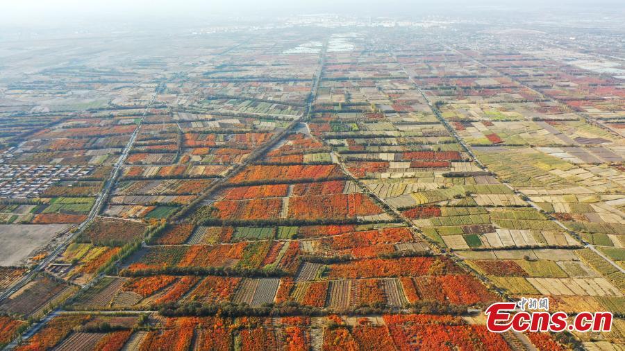 Apricot tree leaves change color during the late autumn in Nanhu Village, Xiazhen Town, Toksun County, Northwest China's Xinjiang Uygur Autonomous Region.(Photo: China News Service/Hu Guokai)