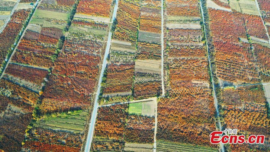 Apricot tree leaves change color during the late autumn in Nanhu Village, Xiazhen Town, Toksun County, Northwest China's Xinjiang Uygur Autonomous Region.(Photo: China News Service/Han Dong)