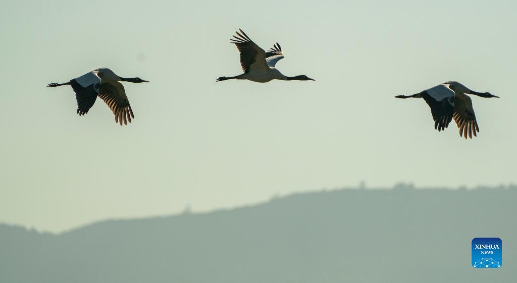 Black-necked cranes fly over the Napa Lake Nature Reserve in Shangri-la of Diqing Tibetan Autonomous Prefecture, southwest China's Yunnan Province, Oct. 29, 2021. More than 200 black-necked cranes have been spotted arriving at the Napa Lake Nature Reserve for wintering. (Xinhua/Jiang Wenyao)