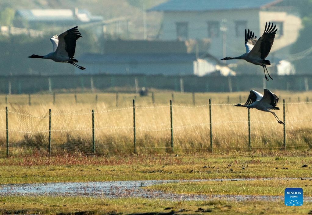 Black-necked cranes are seen at the Napa Lake Nature Reserve in Shangri-la of Diqing Tibetan Autonomous Prefecture, southwest China's Yunnan Province, Oct. 29, 2021. More than 200 black-necked cranes have been spotted arriving at the Napa Lake Nature Reserve for wintering. (Xinhua/Jiang Wenyao)