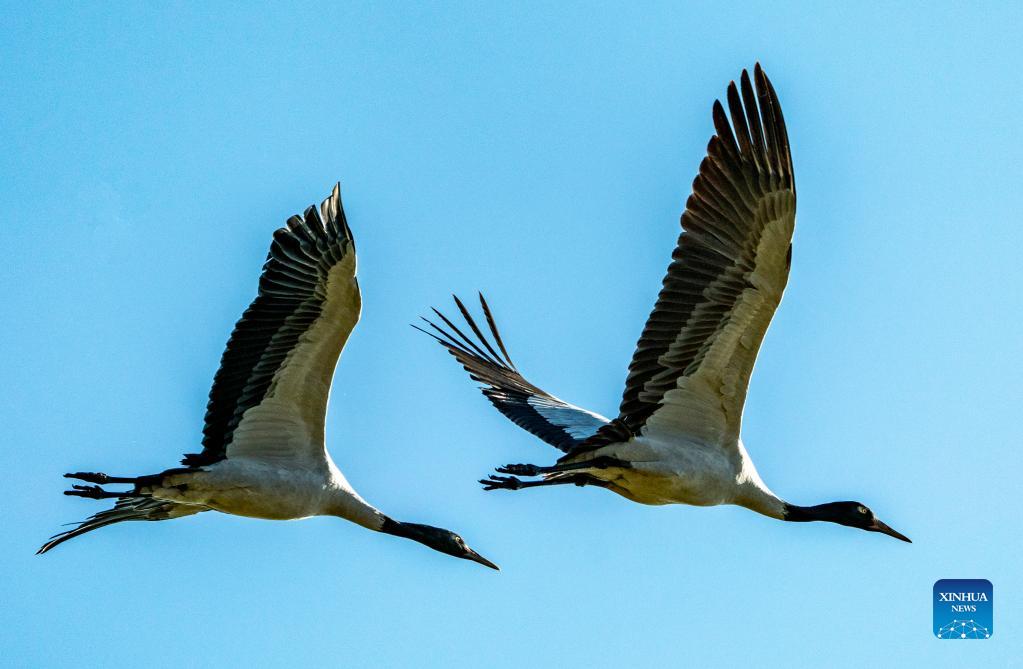 Black-necked cranes fly over the Napa Lake Nature Reserve in Shangri-la of Diqing Tibetan Autonomous Prefecture, southwest China's Yunnan Province, Oct. 29, 2021. More than 200 black-necked cranes have been spotted arriving at the Napa Lake Nature Reserve for wintering. (Xinhua/Jiang Wenyao)