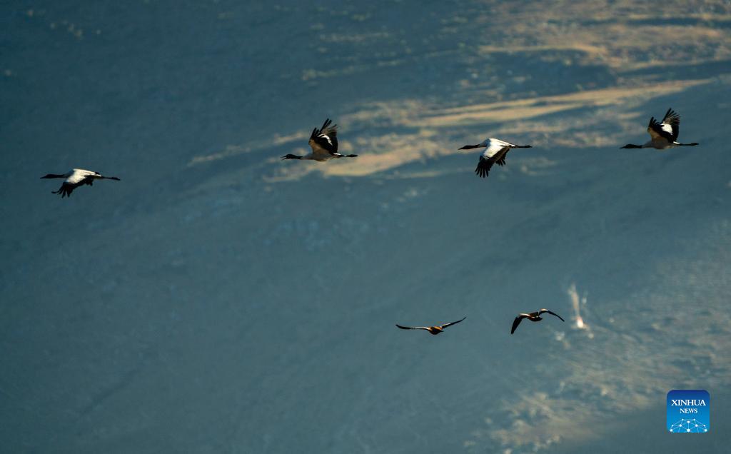 Black-necked cranes fly over the Napa Lake Nature Reserve in Shangri-la of Diqing Tibetan Autonomous Prefecture, southwest China's Yunnan Province, Oct. 29, 2021. More than 200 black-necked cranes have been spotted arriving at the Napa Lake Nature Reserve for wintering. (Xinhua/Jiang Wenyao)