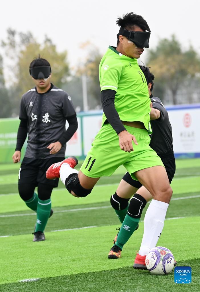 Zhu Ruiming (front) shoots during a match in China's 11th National Games for Persons with Disabilities, in Shaanxi, China, on Oct. 23, 2021. This year, many blind football players who have international match and Paralympic experience competed in China's 11th National Games for Persons with Disabilities and the 8th National Special Olympics in Xi'an, capital of Shaanxi Province, which shows the growth in number of Chinese elite blind football players. (Xinhua/Li Yibo)