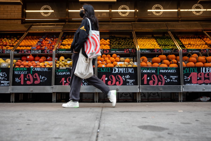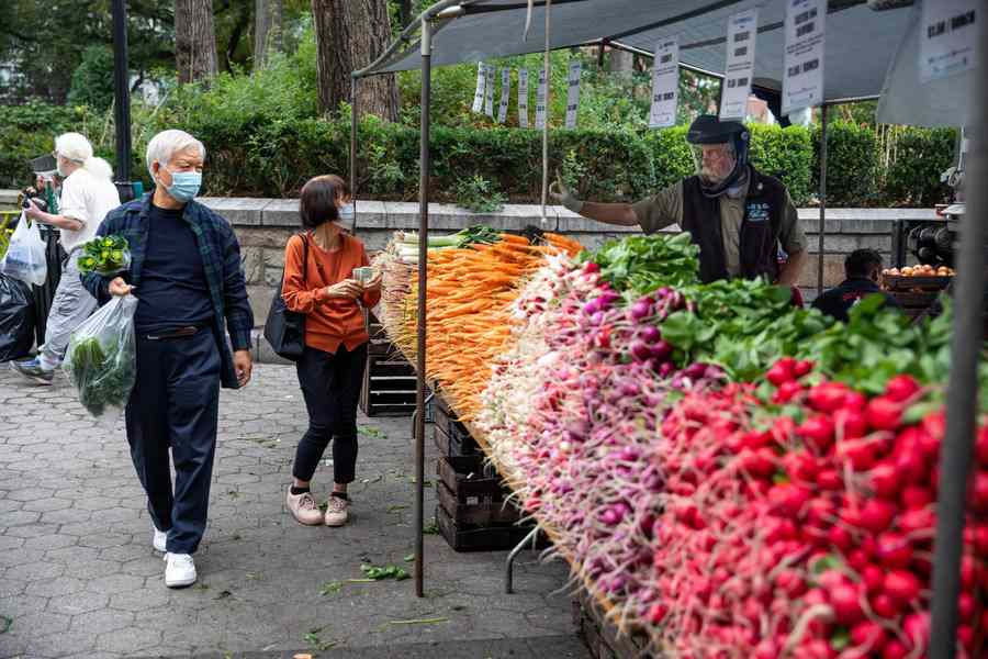 People shop for vegetables at a market in New York, the United States, on Oct. 13, 2021. (Xinhua)