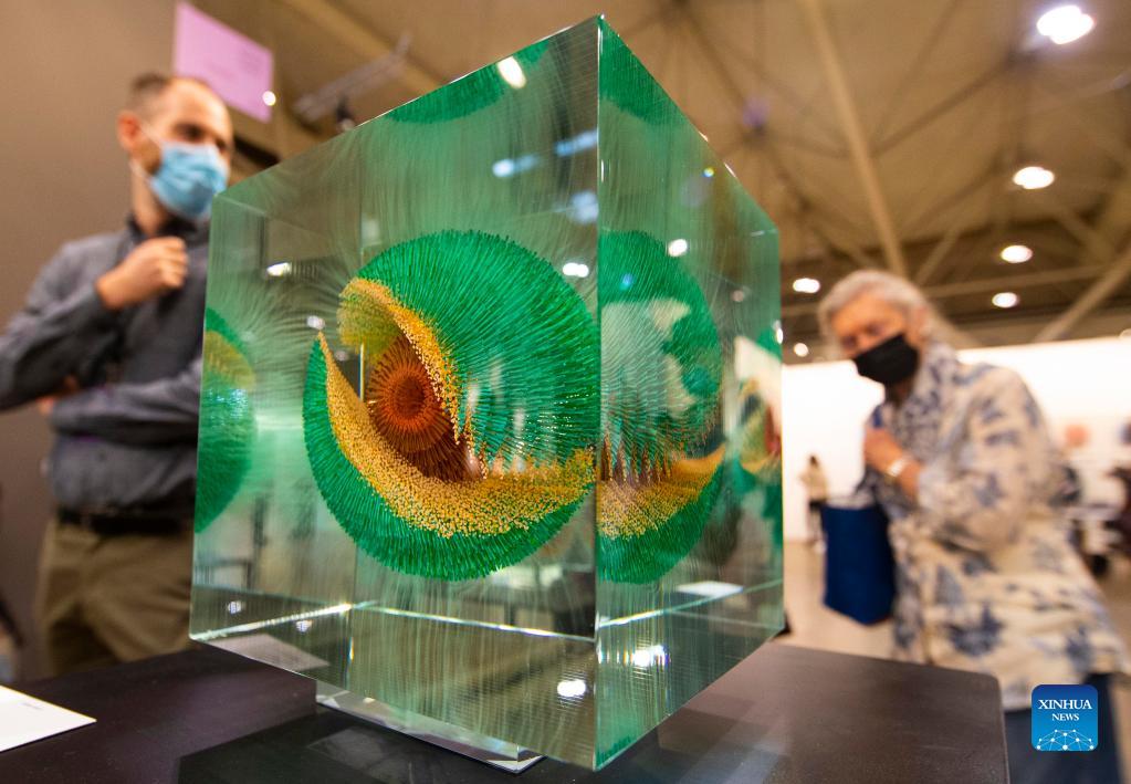 Visitors look at an artwork during the Art Toronto 2021 at the Metro Toronto Convention Center in Toronto, Canada, on Oct. 29, 2021. With participation of over 60 galleries focusing on contemporary art, the art fair kicked off on Friday. (Photo by Zou Zheng/Xinhua)