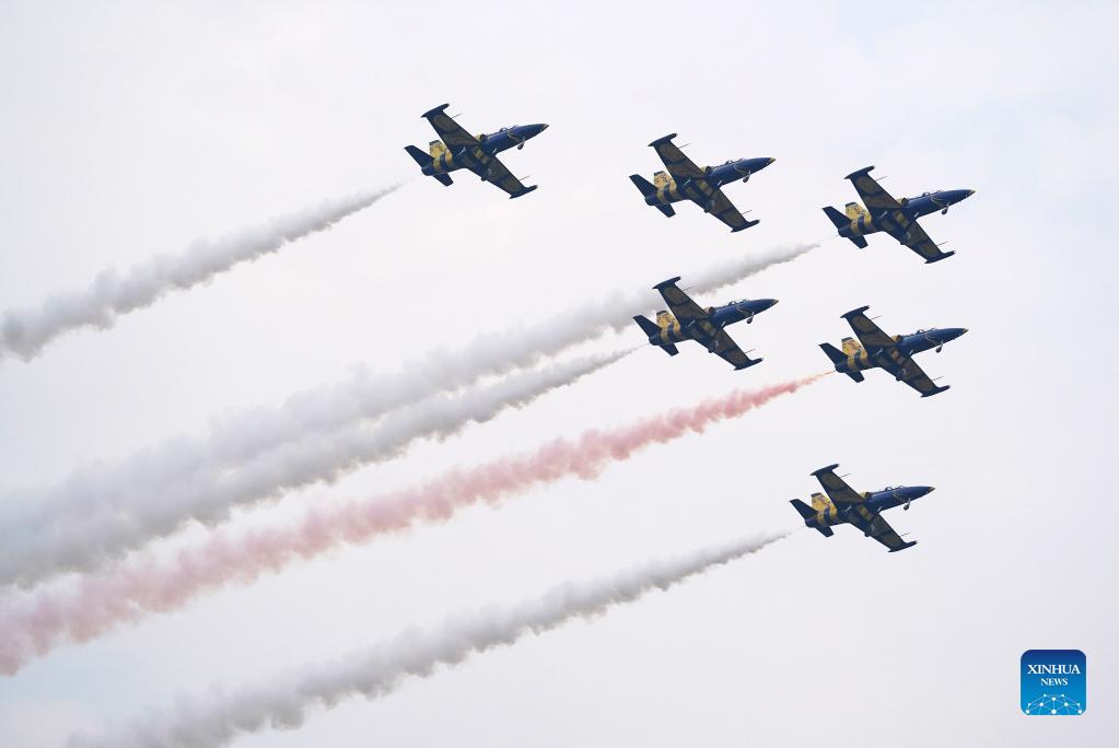 An aerobatic team performs during the 2021 Nanchang Flight Convention at Yaohu Airport in Nanchang, capital of east China's Jiangxi Province, Oct. 29, 2021. The 2021 Nanchang Flight Convention is held here from Oct. 29 to 31. (Xinhua/Wan Xiang)