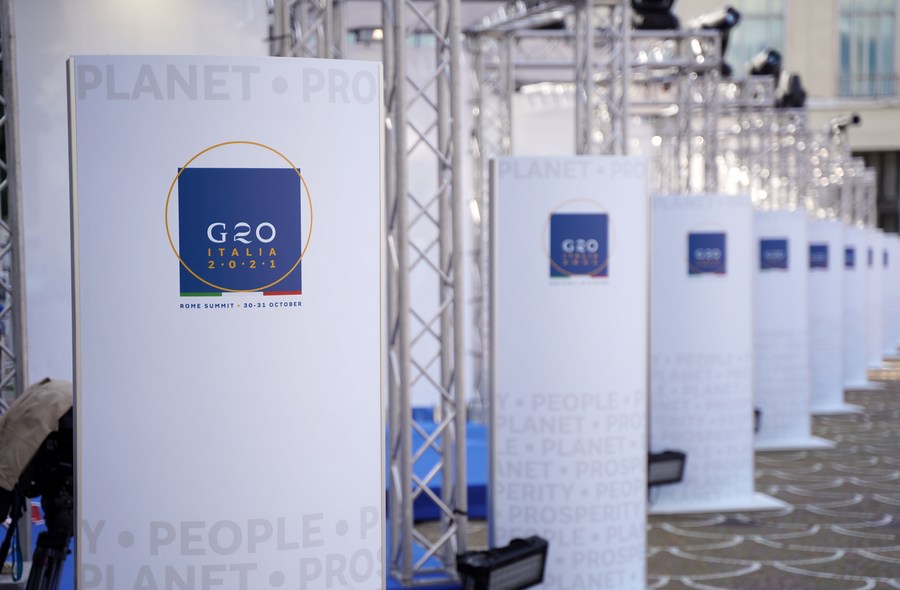 Photo taken on Oct. 28, 2021 shows signs of "G20 Italy 2021" at the media center of the G20 Heads of State and Government Summit in Rome, Italy. (Xinhua/Jin Mamengni)