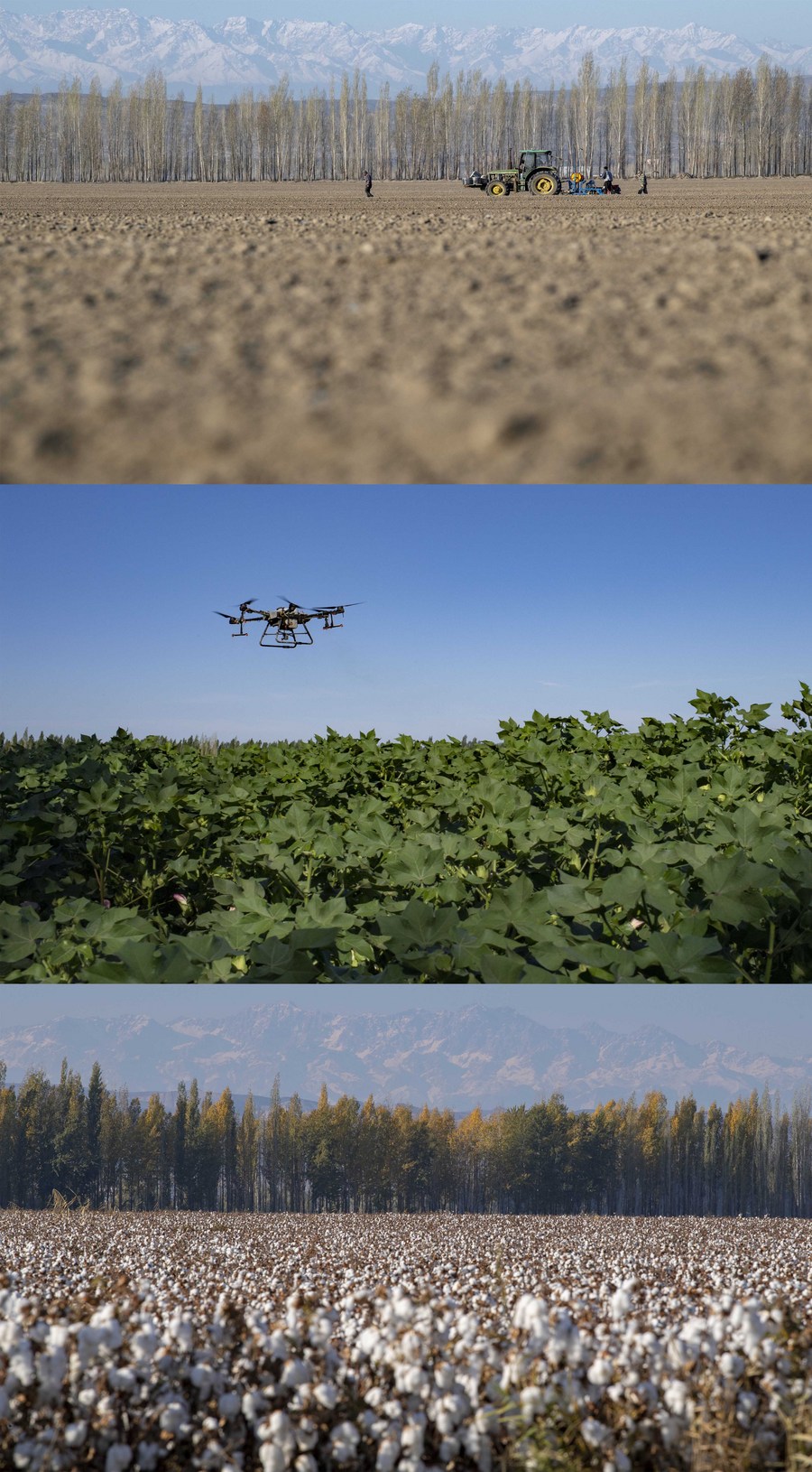 Combo photo taken in Lu Gaolin's cotton field shows cotton seed sowing underway on April 15, 2021 (top), a drone spraying pesticide (middle) on July 15, 2021 and cotton to be harvested on Oct. 28, 2021 in Shawan City, northwest China's Xinjiang Uygur Autonomous Region. (Xinhua/Hu Huhu)