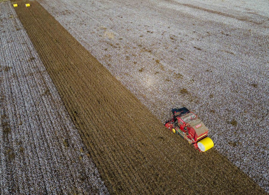 URUMQI, Oct. 31 (Xinhua) -- In four days, Lu Gaolin, a cotton farmer in northwest China's Xinjiang Uygur Autonomous Region, completely finished harvesting his 64-hectare cotton field thanks to a gigantic green machine.